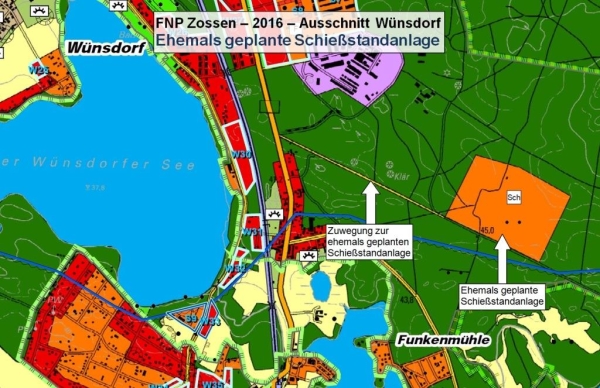 Ein Bürger hat in seiner Stellungnahme zu Recht auf die fehlerhafte farbliche Kennzeichnung der Zuwegung zur ehemals geplanten Schießanlage in Wünsdorf aufmerksam gemacht, und darauf hingewiesen, dass diese zu entfernen sei. Die Zuwegung sollte nicht mehr als Fläche für den überörtlichen Verkehr bzw. örtliche Hauptverkehrsstraße dargestellt werden. Stattdessen sollte die Fläche als bestehender Waldweg ohne farbliche Kennzeichnung übernommen werden. Die Stadtverwaltung wollte diesem Hinweis nicht aufgreifen. Daher habe ich einen entsprechenden Änderungsantrag eingebracht, mit dem die Anregung des Bürgers umgesetzt werden sollte. Hinsichtlich der Frage der Zufahrt zur Schießanlage wurde durch Beschluss des Verwaltungsgerichtes Potsdam die öffentliche Widmung der Zufahrt für die Schießanlage für rechtswidrig eingestuft. Das Oberverwaltungsgericht Berlin-Brandenburg entschied Anfang November 2011, dass dem Antrag der Stadt Zossen, auf Zulassung der Berufung, nicht stattgeben wird. Damit kann die Zuwegung nicht als Fläche für den überörtlichen Verkehr bzw. örtliche Hauptverkehrsstraße dargestellt werden.
