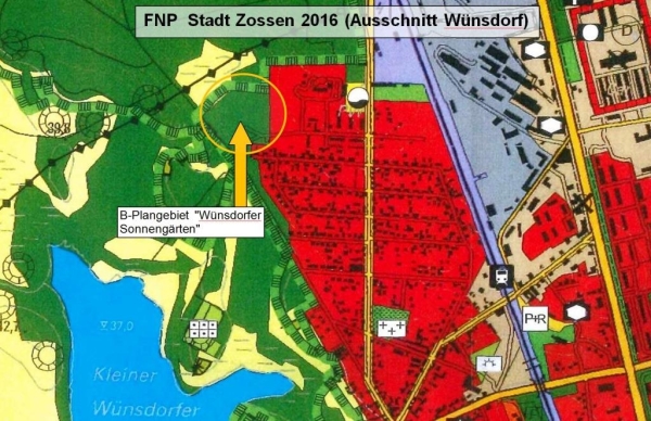 Der Geltungsbereich des Bebauungsplanes „ Wünsdorfer Sonnengärten" im Ortsteil Wünsdorf liegt westlich der Friedenstraße und nördlich der Luisenstraße und erstreckt sich in westlicher Richtung bis zur Mellenseestraße. Das Gebiet umfasst eine Größe von 84.470 m² in der Gemarkung Wünsdorf. Entstehen sollen ca. 75 bis 90 Einzel- oder Doppelhäuser mit bis zu 2 Geschossen. Die Grundstücksgrößen sollen mindestens bei 500 m² liegen. Die Stadtverordnetenversammlung der Stadt Zossen hatte kurz zuvor den FNP der Stadt Zossen beschlossen. Das jetzt in Rede stehende B-Plangebiet ist in wesentlichen Teilen nicht als Bauland im gerade verabschiedeten FNP der Stadt Zossen berücksichtigt. Stattdessen ist das Areal im FNP als Wald ausgewiesen. Insofern habe ich der Beschlussvorlage nicht zugestimmt.