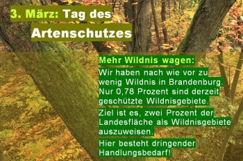 Brandenburg muss wilder werden: Der 03. März ist Tag des Artenschutzes: Ein guter Anlass um mehr Wildnis in Brandenburg zu fordern. Wir haben nach wie vor zu wenig Wildnis in Brandenburg. Nur 0,78 Prozent bzw. 1 Prozent sind derzeit geschützte Wildnisgebiete. Damit liegt Brandenburg weit hinter den Zielen zur Schaffung reiner Wildnisgebiete zurück. Die Bundesregierung hatte bereits im Jahr 2007 beschlossen, zwei Prozent der Landesfläche für Wildnisgebiete bereitzuhalten. Wenig tröstlich ist dabei, das Deutschland insgesamt nur auf eine Quote von 0,6 Prozent kommt. Unser Nachbarland Mecklenburg-Vorpommern kommt hingegen auf 1,58 Prozent.