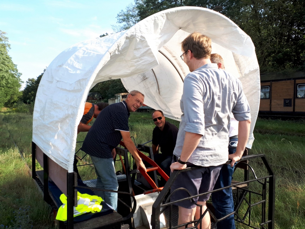 Mit der Draisine können die Gleise der Dabendorf-Mittenwalde-Königs Wusterhausener Eisenbahn derzeit genutzt werden. Besser wäre ein gut getakteter Eisenbahnverkehr auf der Strecke. Um das deutlich zu machen organisierte DIE LINKE am Mittwoch eine kurzweilige Draisinenfahrt an der Christian Görke, verkehrspolitischer Sprecher der Linken im Landtag, Frank Lienig, vom Fahrgastverband PRO BAHN e.V., Ronny Kretschmer, finanzpolitischer Sprecher der Linken im Landtag, Michael Wippold, Kreisvorsitzende der Linken in Dahme-Spreewald, Fritz R. Viertel, Referent für Landesentwicklung und Verkehr in der Landtagsfraktion DIE LINKE und ich teilnahmen.