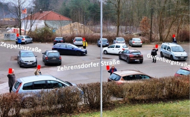 Einwohner protestierten in Wünsdorf-Waldstadt mit einem Flashmob gegen die gefährlichen Verkehrszustände im Bereich der Kreuzung Zeppelinstraße, Gutenbergstraße und Zehrensdorfer Straße. Der Verkehrsraum ist sehr unübersichtlich. Parkplatzbereiche, Fahrbahnbereiche, Fußgängerwege etc. sind nicht voneinander getrennt, sondern bilden eine planlose Fläche. Es gab auch schon Unfälle. Gefordert werden von der Stadtverwaltung Lösungen und Auswege aus dem Verkehrschaos.