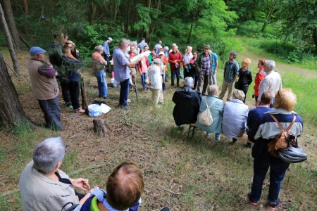 Auf großes Interesse stieß die Exkursion zum Teufelssee bei Sperenberg. Eingeladen hatte der BUND Brandenburg aus Anlass des Geo-Tages der Natur. Als BUND-Landesvorsitzender stellte ich den mehr als 50 Teilnehmerinnen und Teilnehmern in Sperenberg das Naturschutzgebiet „Teufelssee“ vor. Dieses Gebiet steht seit 1937 unter Naturschutz. Es handelt sich um ein Moor mit Torfmoos- und Wollgrasvegetation sowie einem bedeutenden Krebsscherenbestand. Bemerkenswert ist auch das Vorkommen des einheimischen Rundblättrigen Sonnentaus, einer fleischfressenden Pflanze.