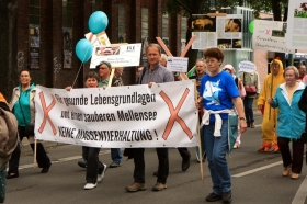 Bei der Abschlusskundgebung auf dem Luisenplatz wurden in einer Talkrunde die agrarpolitischen Sprecher der im Brandenburger Landtag vertretenen Parteien – Udo Folgart (SPD), Dr. Michael Luthardt (Die Linke), Dieter Dombrowski (CDU), Axel Vogel (Bündnis 90/Die Grünen) und Gregor Beyer (FDP) – mit Fragen zur nachhaltigen Landwirtschaft konfrontiert. Der neue Landtag wird sich mit dem Thema beschäftigen. Das Aktionsbündnis Agrarwende Berlin-Brandenburg hat mit anderen Verbänden und Organisationen, so z. Bsp. dem BUND Brandenburg eine Volksinitiative gestartet, mit der der Landtag gezwungen werden soll, sich mit dem Thema zu befassen. 20 000 Unterschriften sind dafür notwendig. Laut BUND sind es bereits 35 000.