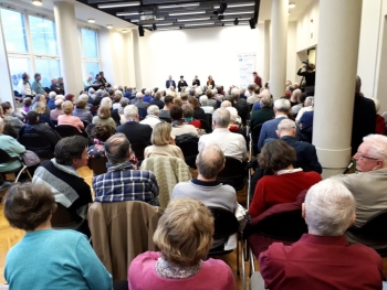 Über 250 Gäste kamen am 26.03.2018 zu einer Gesprächsrunde mit Daniela Dahn (Publizistin), Kerstin Kaiser (Leiterin des Regionalbüros Russland der RLS) und Matthias Platzeck (Deutsch-Russisches Forum e.V.) in die Rosa-Luxemburg-Stiftung(RLS) Berlin.