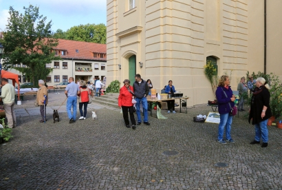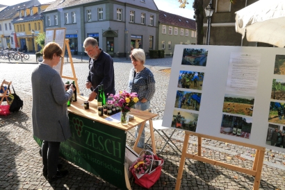 Der Markt wurde extra auf den Sonntag verschoben, um ihn mit dem Erntedankfest zu verbinden. Christen erinnern mit dem Erntedankfest an den engen Zusammenhang von Mensch und Natur. Traditionell wurde der Altar der Zossener Kirche zum Abschluss der Ernte mit Obst, Gemüse, Brot oder Getreide festlich geschmückt. Seit die Menschen Ackerbau und Viehzucht betreiben, gehört der Erntedank zu den wichtigen Festen im Jahreskreis. Gerade in Anbetracht der industriellen Massenherstellung von Lebensmitteln verändert sich die Bedeutung des Festes. Ein Bezug oder eine Abhängikeit zur heimischen Ernte ist bei vielen Menschen weitestgehend verloren gegangen - nicht aber die Freude, Erntedank zu feiern. Nach dem Erntedankgottesdienst füllte sich der Markt nochmals. Händler und Besucher konnten die wohltuende Herbstsonne genießen. Die gute Stimmung nutzten viele Marktbesucher und Händler auch für anregende Gespräche bei einem Stück Kuchen oder einer Tasse Kaffee.