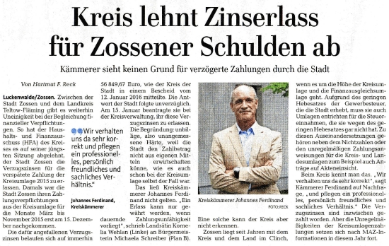 Die Zossener Rundschau vom 07.07.2016 berichtet darüber, dass die angefallenen Verzugszinsen, die der Stadt Zossen aus der zu spät bezahlten Kreisumlage 2015 entstanden, durch den Kreis erwartungsgemäß nicht erlassen werden. Die Verzugszinsen belaufen sich auf 56.849,67 EURO!!! Eine Summe die allein Zossens Bürgermeisterin zu verantworten hat.