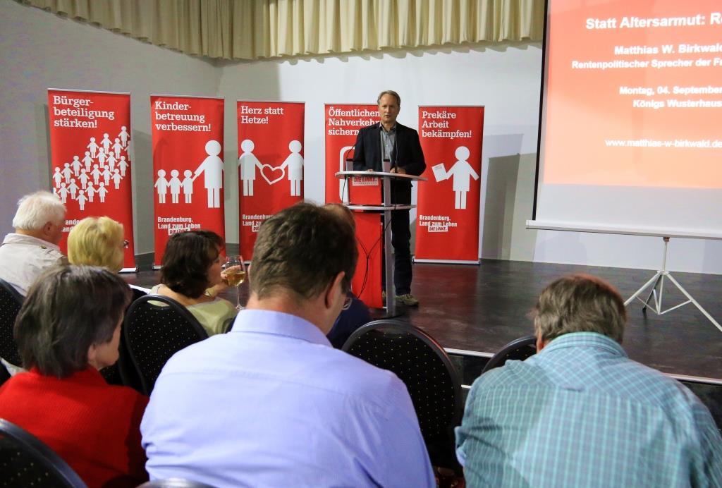 Zum Thema "Statt Altersarmut - Renten rauf!" war Matthias W. Birkwald, rentenpolitischer Sprecher für DIE LINKE im Bundestag, am Montag zu Gast in Königs Wusterhausen. In einem fulminanten Vortrag erläuterte er die Forderungen und Vorschläge der Partei DIE LINKE für eine solidarische Mindestrente und ein gutes Auskommen im Alter.