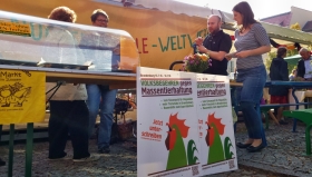 Mitglieder des BUND Brandenburg und der Partei DIE LINKE Zossen sammelten bei herrlichem Sonnenschein Unterschriften für Anträge auf Zusendung der Briefeintragungsunterlagen für das Volksbegehren gegen Massentierhaltung. Auf dem Kraut- und Rübenmarkt werden Produkte aus regionalem Anbau, Kunstgewerbe, Korbwaren aus der Region etc. feilgeboten. Die Botschaft: Obst, Gemüse, Honig, Wein oder Blumen müssen nicht über Tausende von Kilometern zum Verbraucher transportiert werden, Einheimisches schmeckt auch besser. Dieser Ansatz passt hervorragend zum Volksbegehren gegen Massentierhaltung.