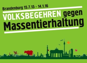 Ab Mittwoch, den 15.07.2015, können alle, die gegen eine Erweiterung der Anlagen für Massentierhaltung sind und die eine bessere Behandlung der Tiere fordern, dafür ihre Stimme abgeben. Das Volksbegehren gegen Massentierhaltung des Aktionsbündnises Agrarwende Berlin-Brandenburg hat ab dem 15. Juli sechs Monate Zeit, um die benötigten 80.000 Unterschriften zu sammeln.