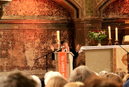 In der Zionskirche gab es einen beeindruckenden Friedensgottesdienst. Margot Käßmann hielt die Predigt. Sie kritisierte u. a. Scharf die geplante Erhöhung der Militärausgaben von 1,2 Prozent auf 2 Prozent des Bruttoinlandsprodukts. Damit würde der Militäretat von derzeit 34,3 Milliarden EURO auf künftig mehr als 60 Milliarden EURO. Organisiert wurde der Gottesdienst von der Evangelischen Arbeitsgemeinschaft für Kriegsdienstverweigerung und Frieden (EAK).
